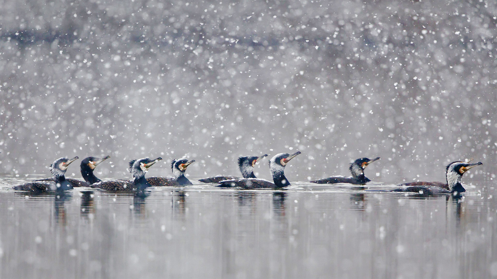 Great cormorants gliding through a snowstorm in Hesse